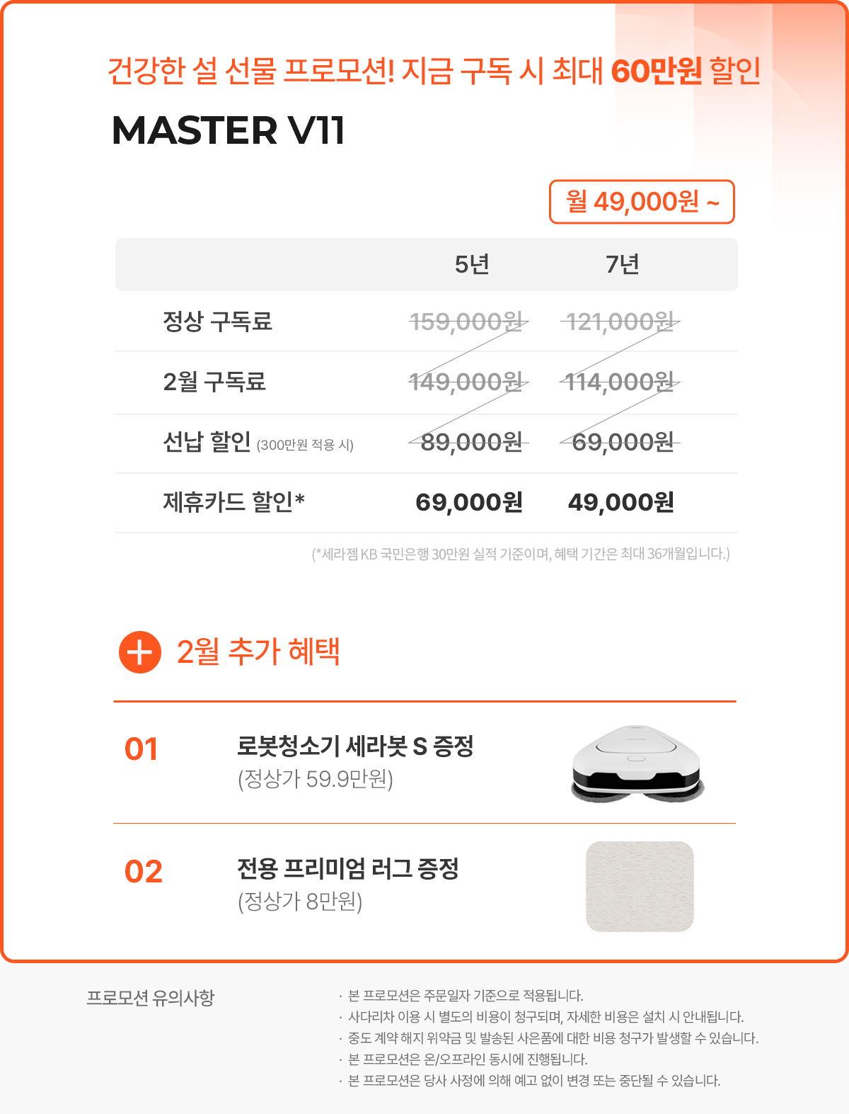 - 무료배송 (계약고객은 구독 등록비 20만원 및 설치비 10만원 무료 혜택 제공)