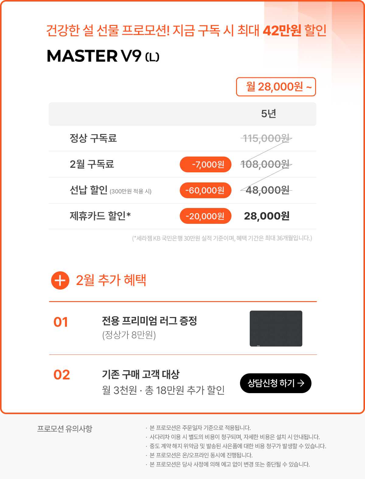 - 무료배송 (계약고객은 구독 등록비 20만원 및 설치비 10만원 무료 혜택 제공)