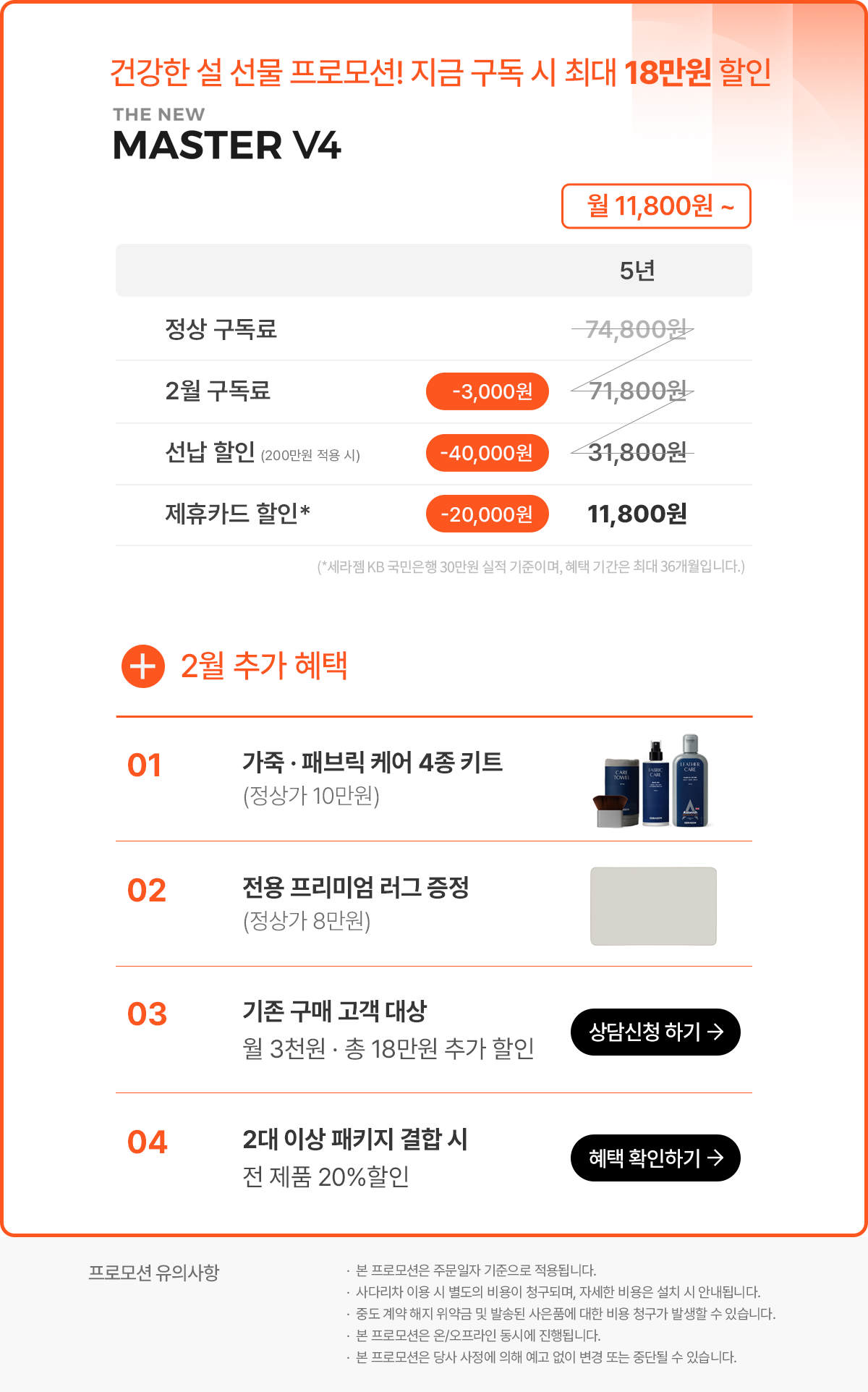 - 무료배송 (계약고객은 구독 등록비 20만원 및 설치비 10만원 무료 혜택 제공)
