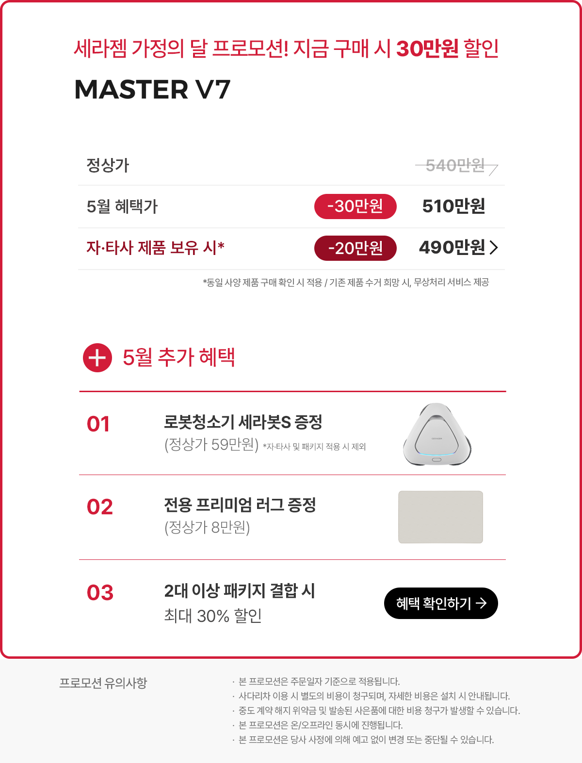의료기기 마스터 V7은/는 세라젬에서 출시한 제품으로 5가지 효능·효과에 대해 식약처 허가를 받은 의료기기입니다. 사용자의 하중을 정밀 측정해 척추 길이와 굴곡도를 분석하는 스파인 스캔 기능을 탑재했으며, 목과 어깨를 밀착 마사지하는 4세대 TST 세라코어 엔진을 적용했습니다. 최대 65˚C 온열 기능과 20가지 마사지 모드를 지원하며, 이지 슬라이딩 구조와 무진동·저소음 설계로 편의성을 높였습니다. 에어셀 다리 마사지기와 복부 온열 LED 도자가 구성품으로 포함됩니다.