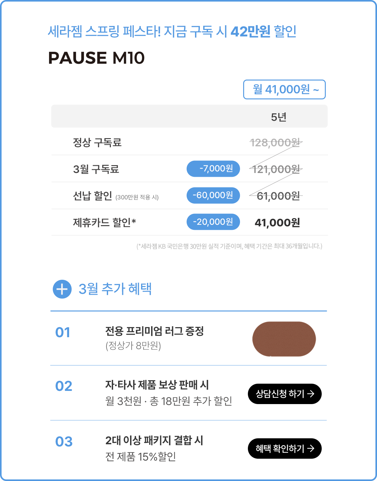- 무료배송 (계약고객은 구독 등록비 20만원 및 설치비 10만원 무료 혜택 제공)