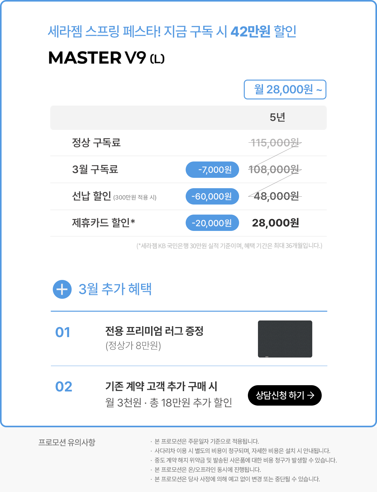 - 무료배송 (계약고객은 구독 등록비 20만원 및 설치비 10만원 무료 혜택 제공)