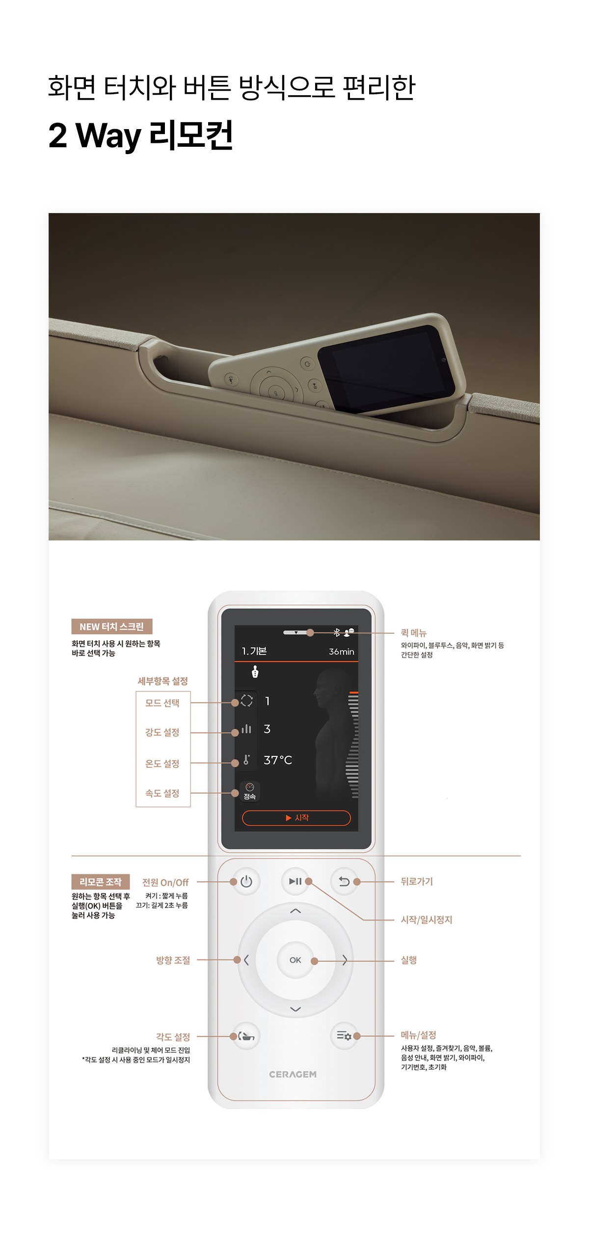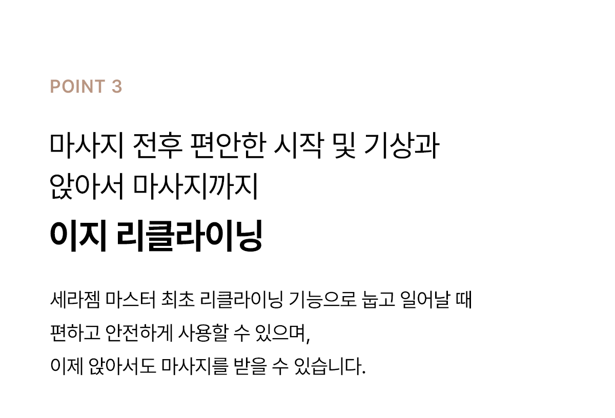 ※ 이전 설치 서비스가 필요할 경우, 세라젬 고객센터로 연락주십시오. (제주 지역 불가, 마스터, 파우제 등 일부 제품 한정, 비용 고객 부담)